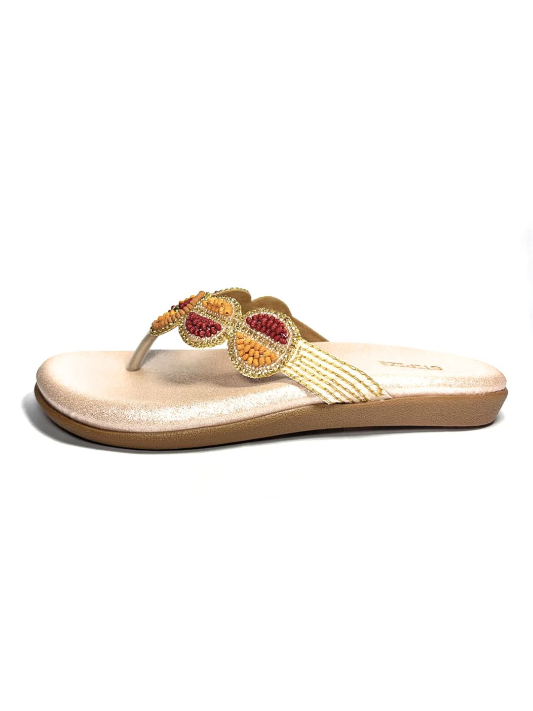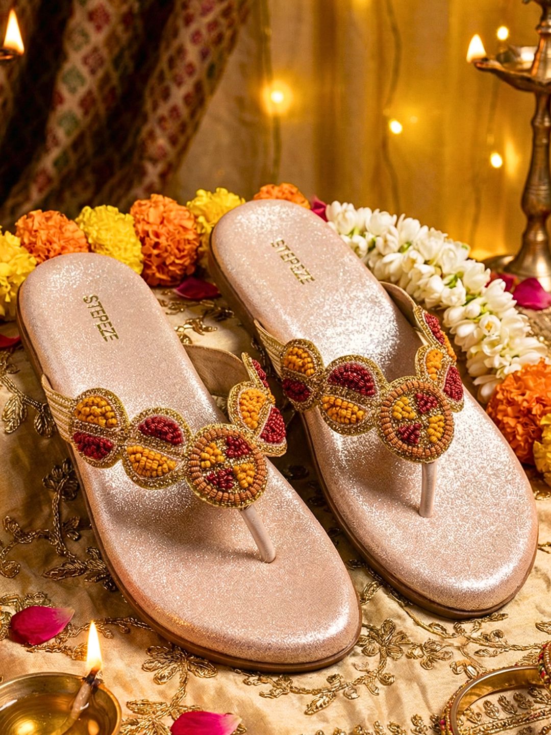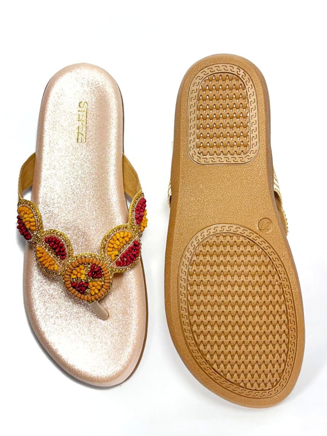 Infuse your traditional wardrobe with a burst of color and sparkle. These STEPEZE flat sandals feature intricate hand-crafted beadwork in vibrant autumn hues, set against a shimmering metallic footbed. Designed for festive celebrations and wedding guest attire, they offer a perfect blend of artisanal craftsmanship and modern comfort.